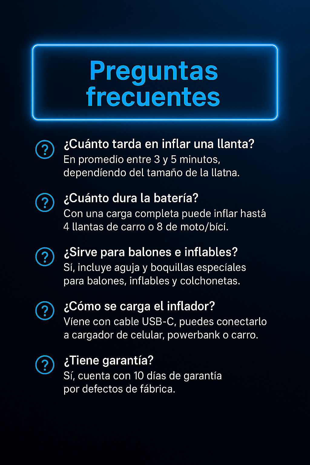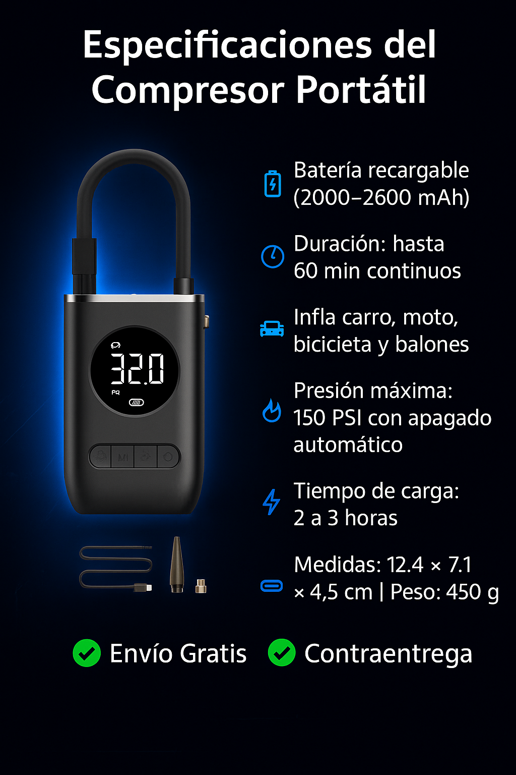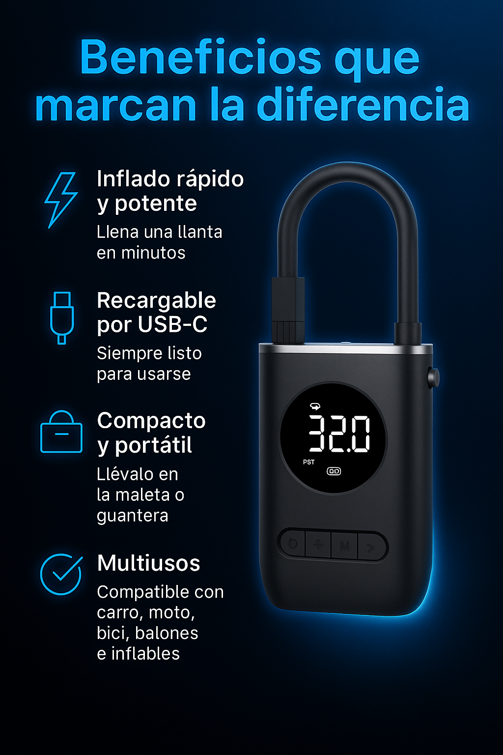 “Lo probé en mi camioneta y funcionó perfecto. Infló la llanta rápido y sin esfuerzo. Ahora lo llevo siempre conmigo.”